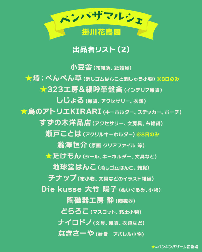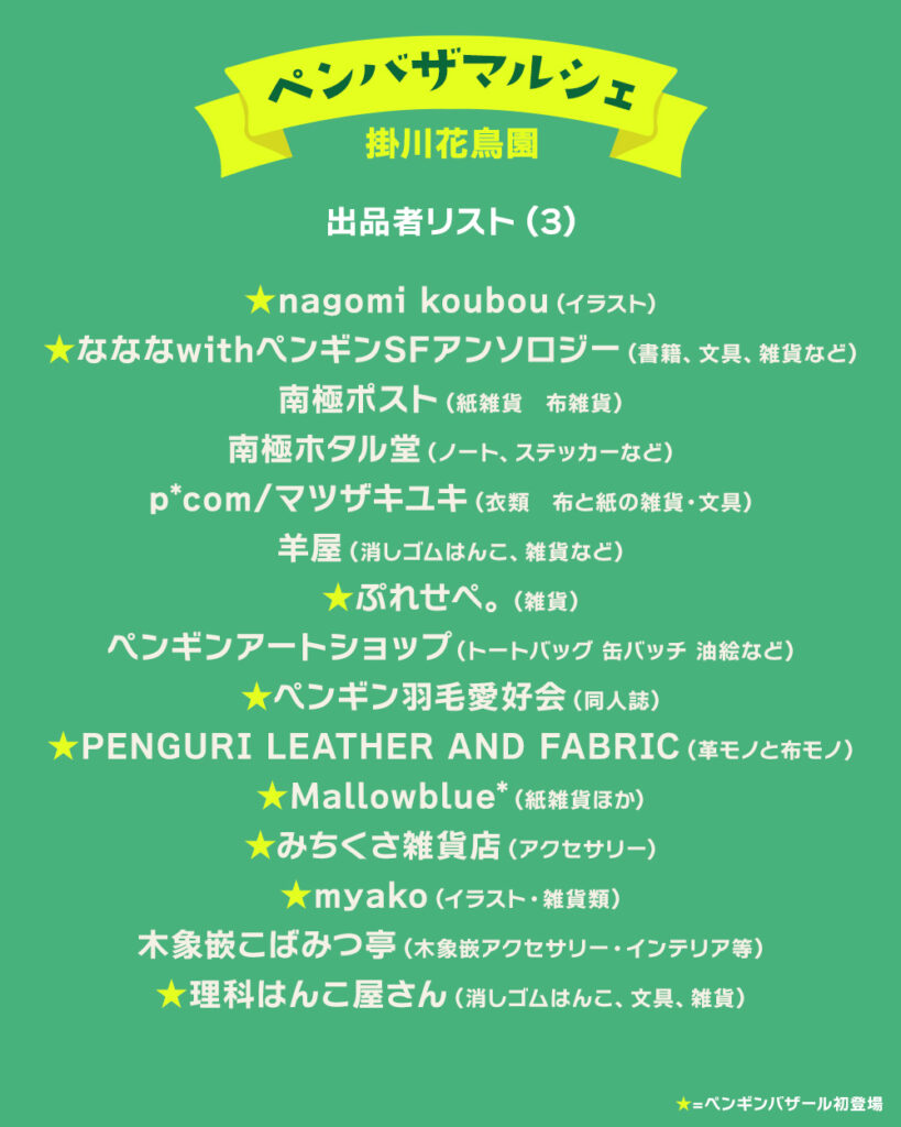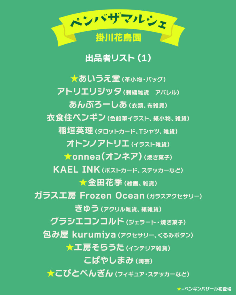 「ペンバザマルシェ」開催のお知らせ Posted on 2025年10月16日 | Posted on 龍哉北条 11月8日(土)、9日(日)の2日間にわたって「ペンバザマルシェ」が開催されます。魅力的な作品を手掛ける全国から集まったペンギンクリエイターの約50店が大集合!「ここでしかでしか買えない」限定ペンギングッズが多数登場します。ぜひお越しください。 ※ペンギンマルシェへの参加は無料ですが、別途掛川花鳥園の入園料がかかります。 ペンバザマルシェ開催期間11月8日(土) 10:00~16:0011月9日(日) 9:00~15:30