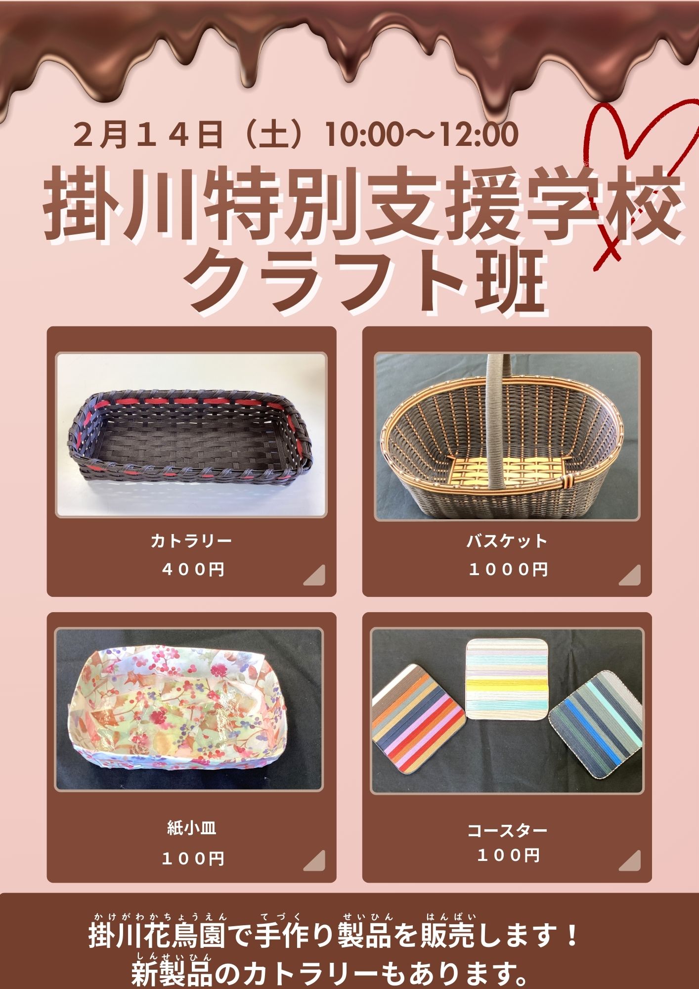 掛川特別支援学校 手作り製品販売のお知らせ Posted on 2026年2月4日 | Posted on 龍哉北条 2026年2月14日(土)、掛川特別支援学校クラフト班による手作り製品特別販売コーナーを設置いたします。 ぜひご覧ください。 開催日:2026年2月14日(土)時間:10:00~12:00※観覧・購入には別途、掛川花鳥園の入園料がかかります。